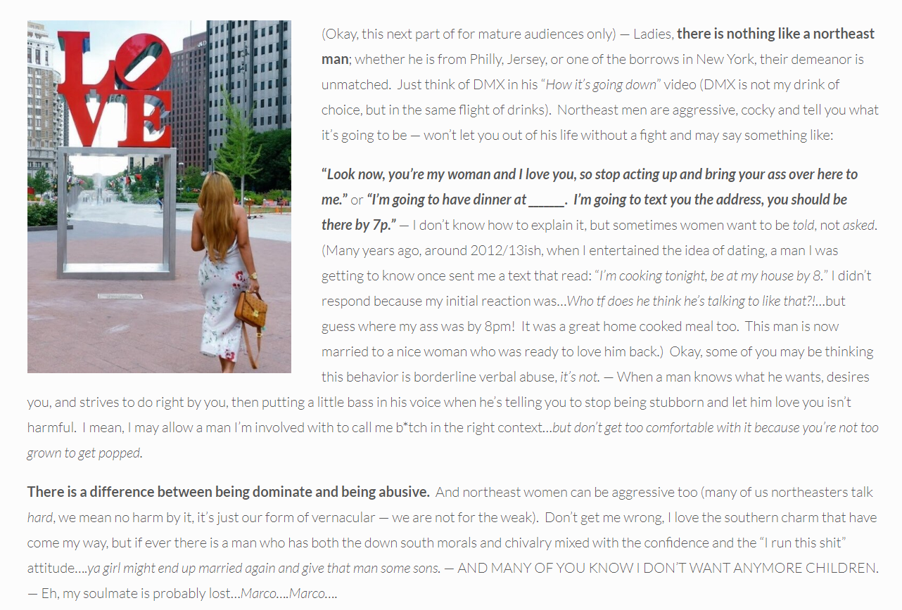 Many of the message were asking me why I have such a bias against southern and west coast men or telling me that I haven’t met the “right” southern guy yet. Let’s be clear…I DON’T HAVE ANY BIAS. My interests with men have much to do with my personal experiences with them, what made/makes me smile, and how I would like for the dynamics of my romantic relationship to be. I just like the dominant nature that many northeast men exude, that doesn’t mean I only prefer them over all or that other men are weak.